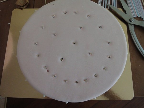 Лучше всего сначала вставить шпажку, ручкой отметить уровень торта, обрезать шпажки и трубочки по первой мерной шпажке. Потом по кругу вставить опоры и пару опор поставить крестом в центре.