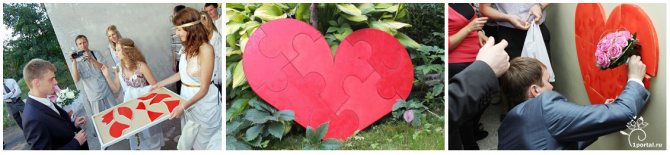 Чтобы подружки отдали ему его ненаглядную, он должен собрать по частям одно сердце. (Подружки накануне вырезают из картона красное сердце, и разрезают его на пазлы. Количество пазлов соответствует количеству заготовленных конкурсов-препятствий для жениха. Лучше их сделать 7, т.к. цифра семь символизирует также семью, и в день её создания это более чем уместно. За каждый непройденный конкурс жених должен выкупить пазл, иначе он не соберёт целое сердце и не получит невесту.)