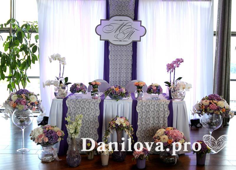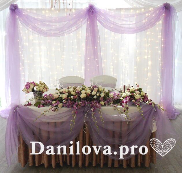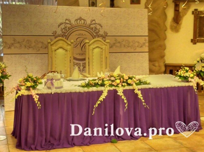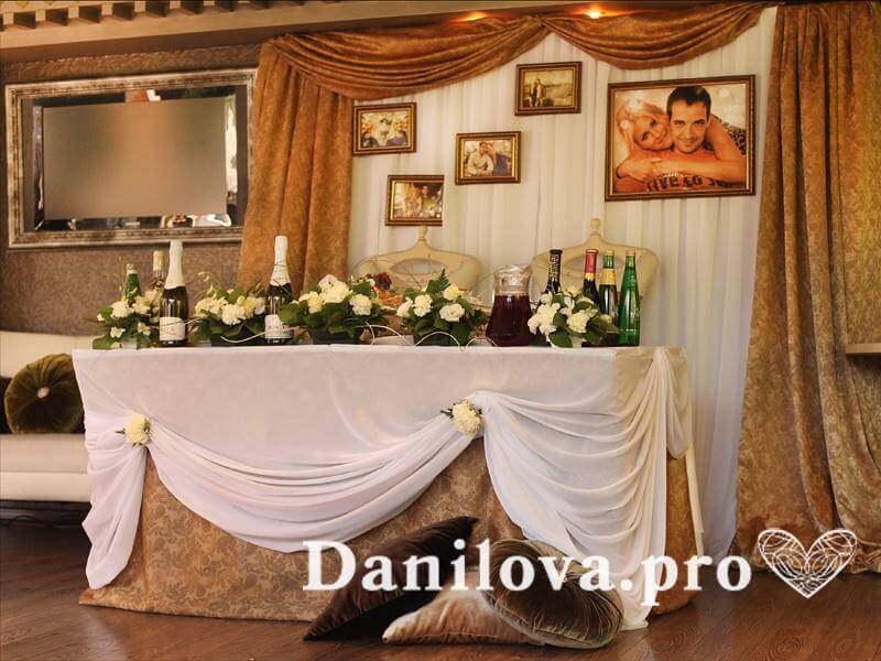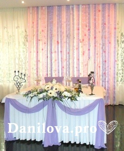 - Стол также нельзя обделять цветами. При оформлении в основном будет задействована его передняя часть, обращенная к гостям. Цветки можно расположить на складках скатерти в виде своеобразной арки, чередуя их по оттенкам. Красиво смотрятся небольшие гирлянды цветов, свисающие, словно выбивающиеся из общей арочной композиции.