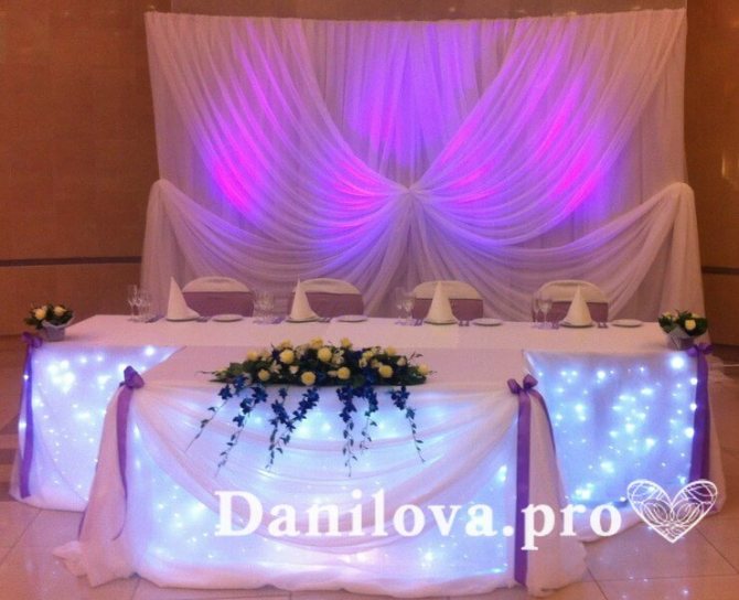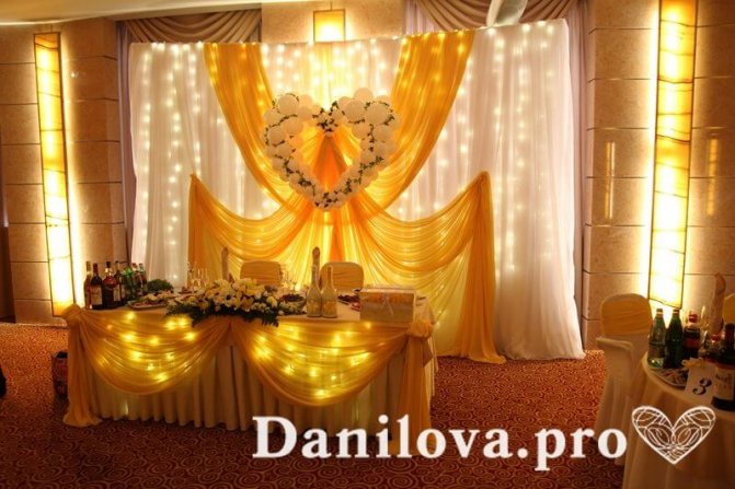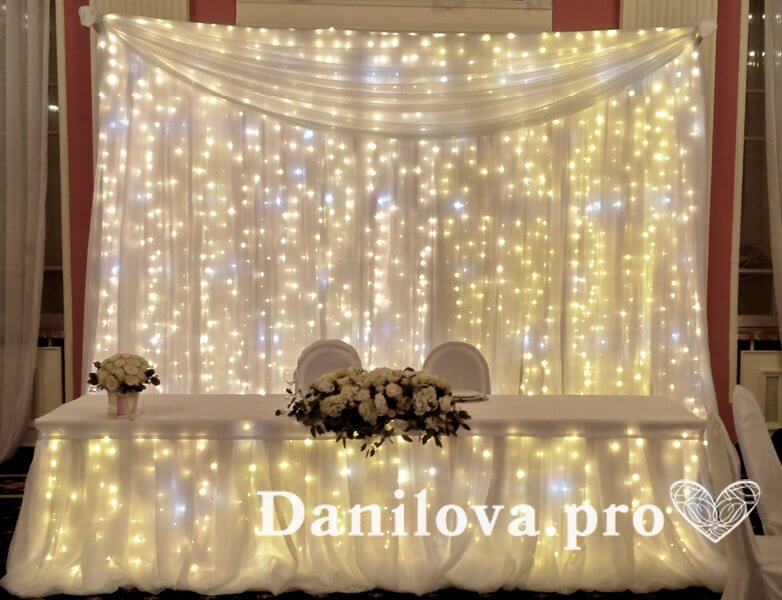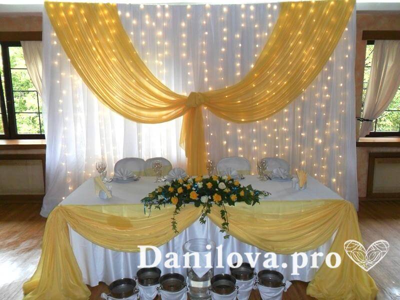 Назвать иллюминацию самодостаточным украшением нельзя, но не упомянуть о ней невозможно. Световые гирлянды и различного рода подсветка шикарно смотрятся в сочетании с тканевым декором. Переливающиеся огоньки как ничто другое удачно подчеркнут торжественность вечера и важность происходящего. Однако обязательно соблюдайте технику безопасности при использовании иллюминации во избежание возгорания.