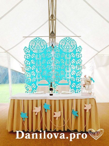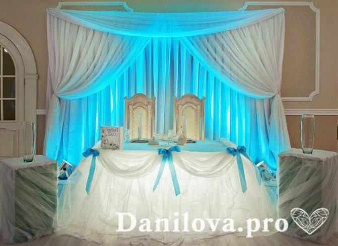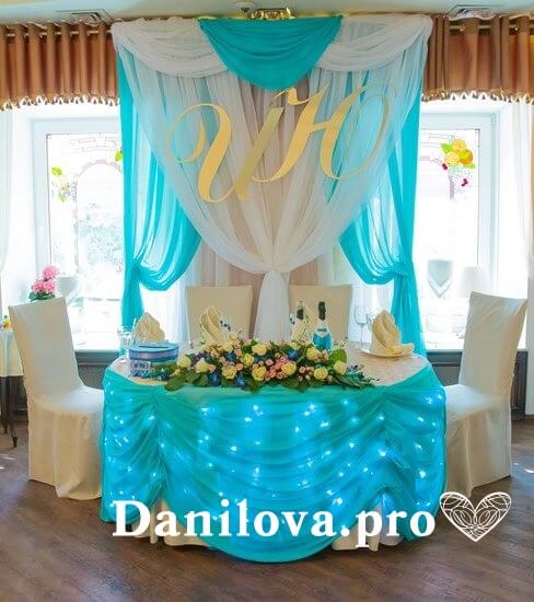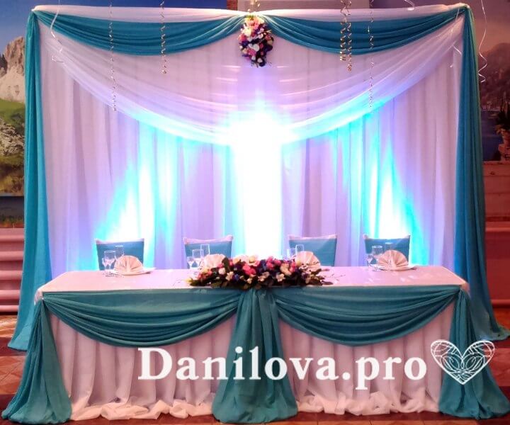 Стоит проявить сдержанность в цветовой гамме. Не стоит сочетать более 3 оттенков, и они не должны быть кардинально контрастными. Допустимо, чтобы отличался только один. Например, если основные цвета свадьбы белый и бирюзовый, то скатерть и стену за спинами молодых лучше сделать светлыми, а драпировку, банты на чехлах мебели выполнить цветными. Немного разбавить палитру можно синими салфетками и лентами, не более.
