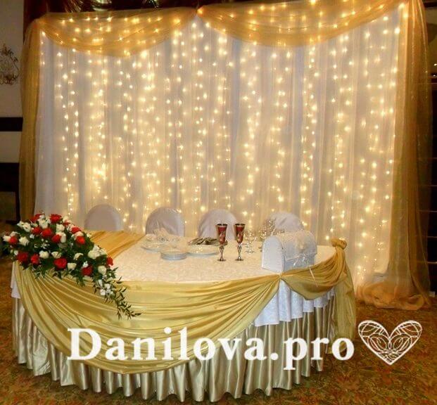 - Великолепно смотрится гирлянда-водопад. Её можно разместить на длинных складках скатерти или украсить ей задник.