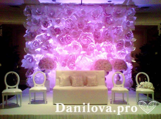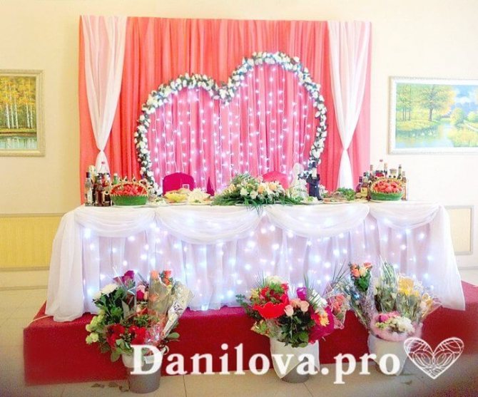 - При желании цветы на заднике можно разместить в виде объемной арки или большого сердца.
