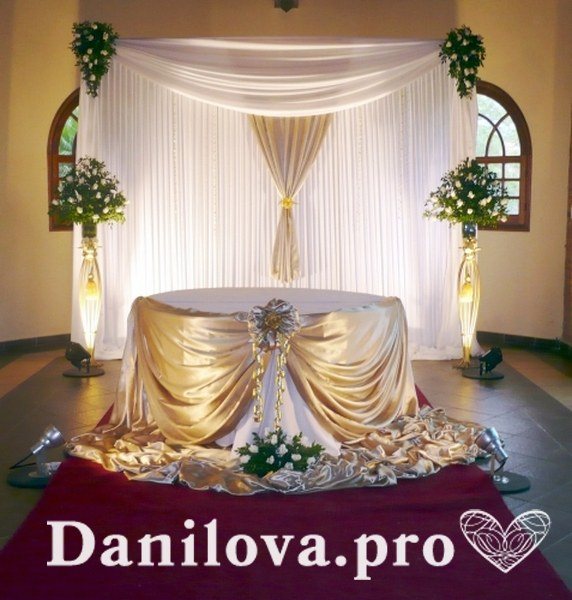 - Так, сочетание белой и красной материи придаст зоне молодых больше роскоши. Стол покрывают белой длинной скатертью, которая спускается до самого низа ровными симметричными складками. Нижнюю часть ткани красиво выкладывают на полу. Контрастную по цвету ткань набрасывают на верхнюю часть стола с одной стороны и драпируют книзу под небольшим углом, закрепляя её на складках скатерти на разных уровнях. Нижние концы ткани в живописном беспорядке располагают на краях скатерти, лежащих на полу.