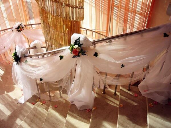 Инновационное веяние– декорирование зала свадебного торжества тканью. Украшают все: колонны, арку «молодых», террасу, лестницу «любви», стены, кортеж, столы и стулья банкетного зала, включая украшение холла.