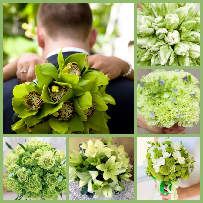 Но существуют и цветы в зеленых тонах. Среди них наиболее часто в свадебных букетах можно встретить: