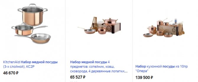 - Посуда. Медный кофейный набор, турка для кофе, чайник, самовар, подстаканники, чашечки из меди, столовые приборы – выбор посуды из благородного металла довольно широк.