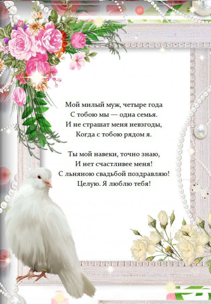 Какой бы подарок ни было решено презентовать, какие бы цветы ни сложились в праздничный букет, не стоит забывать о самом главном – теплых словах и поздравлениях с Льняной годовщиной, которые должны исходить прямо от сердца! Написать их можно в смс, на открытке, или прочитать за столом в виде тоста, они могут быть зарифмованы или нет, многострочные и совсем коротенькие, но точно будут искренними и душевными!