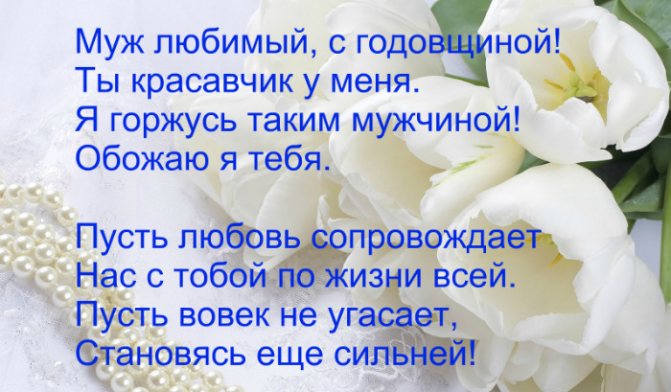 Дорогой мой супруг. Мы с тобой съели пуд соли за эти годы и наелись досыта. Хочу, чтобы ты был, как солдатик оловянный, и мы встретили оловянный юбилей, как стеклышко трезвый, для празднования стеклянной свадьбы, красивый как фарфоровая ваза, и я буду 20 лет любоваться только тобой, а в 25 лет скажу: ты мой серебряный. В 30 – жемчужина моя закаленная и далее все драгоценные камни, это будешь ты. Мечта моя отметить нашу Красную свадьбу. Вот такой должен быть наш союз. Ведь другого кого-то рядом мне и представить сложно.