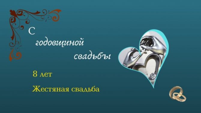 Для поздравления женщины подойдут жестяные предметы домашнего обихода. Это могут быть различные формы для выпечки, миски для салатов, столовые наборы, новые кастрюли, жестяные коробочки для печенья. Если же ваша жена обожает романтику, можно порадовать ее оригинальным подарком — портретом обеих супругов, выполненным из жести. Если вы располагаете достаточными средствами, то замечательным подарком ко дню свадьбы для жены будет новая микроволновка, стиральная машина, или же новенький автомобиль. На восьмую годовщину свадьбы женщине также можно подарить украшения из жести, что также будет оригинально и символично. Когда будет отмечаться восьмой юбилей свадьбы, жена может надеть ваш подарок за праздничный стол.