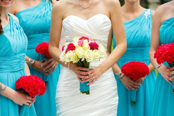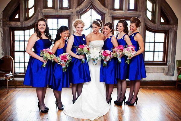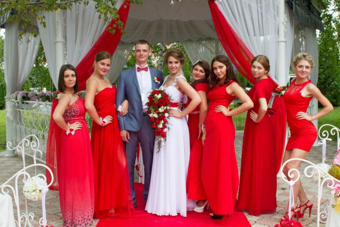 Наряды для подружек невесты могут быть как красного, так и синего цвета. Что касается длины, то лучше выбирать платья длиной до колена. И обязательно проследить, чтобы цветовая гамма отличалась от наряда невесты.