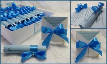 Приглашения в виде свитков напоминают о старинных рыцарских обычаях посылать прекрасным дамам любовные послания. Красивый и необычный вид приглашений синего насыщенного цвета, перевязанного белой атласной ленточкой, вызовет у приглашенных гостей настоящую бурю восторга. Сделать такое приглашение совсем нетрудно.