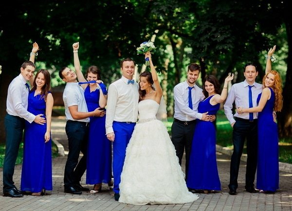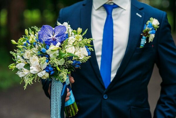 Друзья жениха могут надеть ярко-синие брюки, галстук в тон им и бледно-голубые рубашки. Другой вариант – светлый низ и темный верх. Обязательный аксессуар – бутоньерка, которая должна быть сделана из контрастирующих с одеждой цветов.