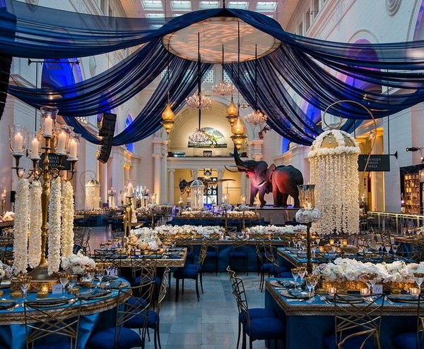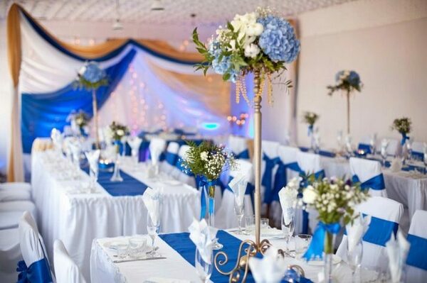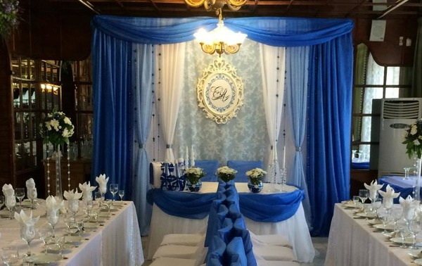 В оформлении зала важную роль играет драпировка. Многие об этом забывают, и помещение для банкета выглядит не очень празднично. Однако если сделать все правильно, даже обычная столовая заиграет новыми красками. Синей тканью можно задекорировать не только стены и вход, но и потолок и пол.