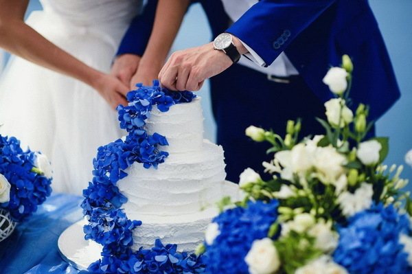 В синих тонах также изготавливается свадебный торт. Цвет придает торту креативность и каждому гостю очень хочется попробовать его кусочек. Синяя глазурь, узоры, съедобные фигурки в выбранном цвете – вариантов основного украшения стола, выдержанного в синей гамме, множество. Стильно смотрятся чередующиеся по цвету ярусы, а оригинальным будет полосатый бело-синий торт.