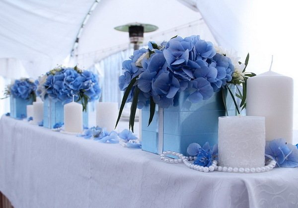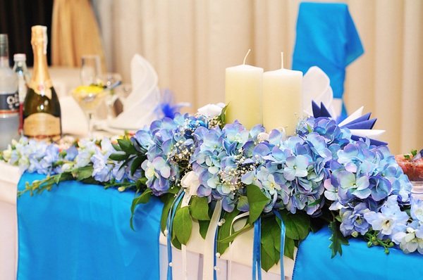 После того, как пригласительные карточки разосланы, необходимо заняться самым трудоемким процессом – это оформление свадебного зала. Основным цветом на такой свадьбы будет выступать, конечно, синий цвет. Именно он станет использовать практически в каждой детали интерьера. Ему можно найти какой-нибудь цвет для сочетания. К примеру, отлично будет смотреться белый цвет. Эта уже будет развернута тематика морского стиля. На свадебных фото будет смотреться очень шикарно и нежно. Оформляя зал цветами, нужно выбирать такие, как васильки, колокольчики. Эти цветы можно использовать для гармонии и в букете невесты. По залу могут быть расставлены вазы, наполненные дельфиниумами. Это прекрасные цветы синего цвета, подчеркивающие нежность и незабываемый насыщенный цвет. Декор синего цвета – это уже насыщенность морской пучины, поэтому всем придется по душе в летний зной этот прохладный оттенок цвета.