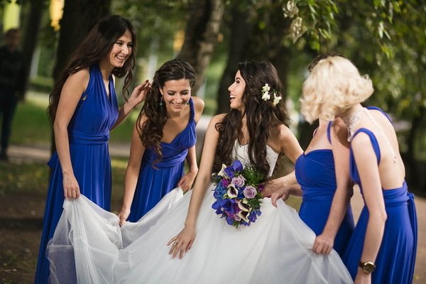Главную виновницу торжества от начала до конца сопровождает подружка, поэтому ее наряд на свадьбе будет очень даже актуален в синих цветовых оттенках.