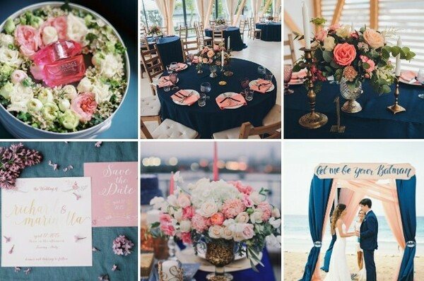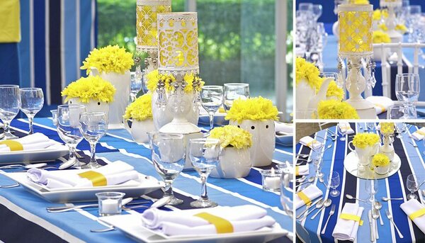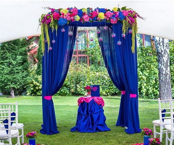 Если торжество проходит на природе, то синий цвет здесь будет гармонично сочетаться с розовым и желтым.