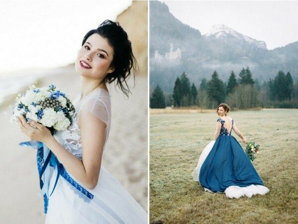 Синяя свадьба основана на контрасте цветов, поэтому и наряды виновников торжества должны выбираться по этому принципу.
