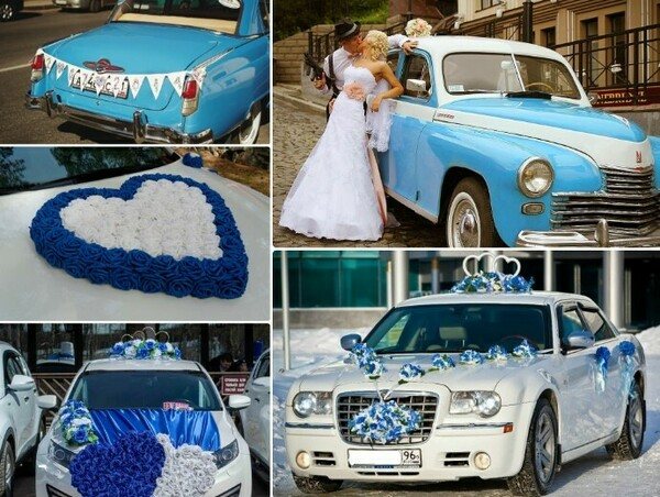 - Что касается украшения машины – то здесь можно пофантазировать. Особых требований нет. Это могут быть лаконичные украшения в виде свадебных колец и цветов в сочетании с лентами. Или объемные композиции.