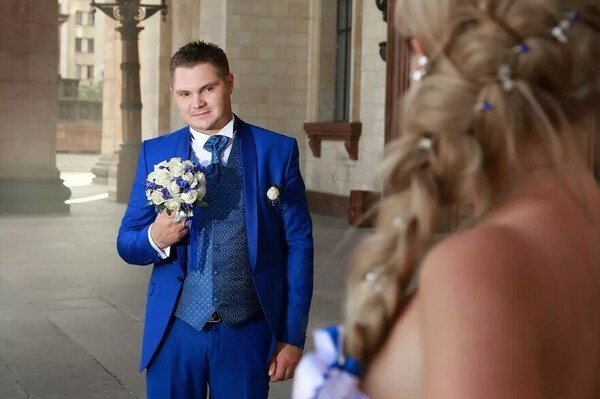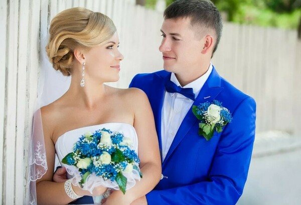 Если у девушки белое платье, то у жениха должен быть синий костюм, сочетающийся с образом невесты. Однако здесь еще стоит учитывать некоторые нюансы для каждого главного героя этого мероприятия.