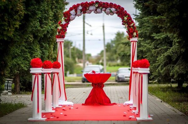 - Эффектно смотрится арка, драпированная красной тканью, украшенная зеленью и цветами.