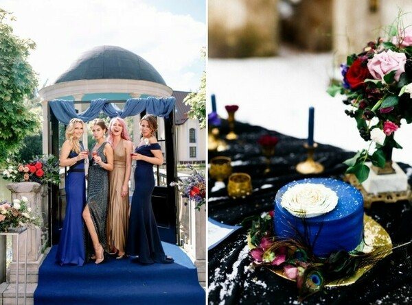 Насыщенный благородный синий оттенок – это идеальный акцент для любых деталей, на которых хочется заострить внимание. Свадебное торжество в этом цвете – это темно синие скатерти на столах, роскошные бокалы из окрашенного стекла, чувственный бархат и полиграфия в цвете ночного неба, прекрасные васильки, ирисы и многое другое.