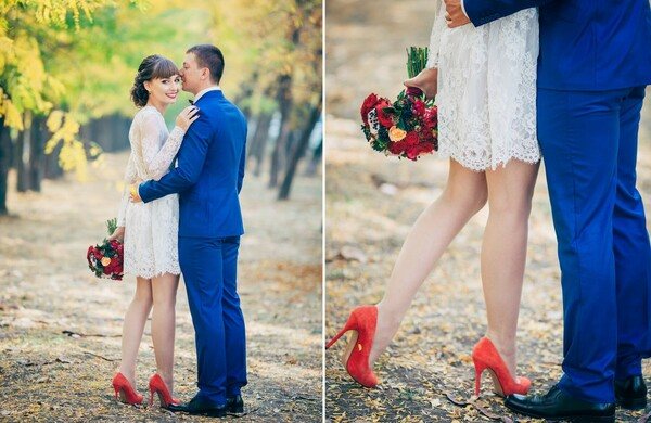Образ невесты будет неполным без обуви. Если платье короткое и белое, выбирайте синие туфли. Главное, чтобы они сочетались по цвету с его отделкой.