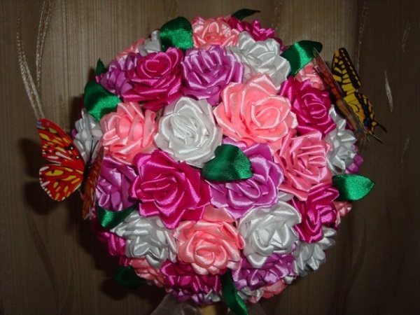 Для невест, которые большое значение придают приметам, искусственный букет также является настоящей находкой, ведь считается, что чем дольше букет простоит, тем дольше продлится счастье. Ленты же способны храниться, не портясь, целую вечность.