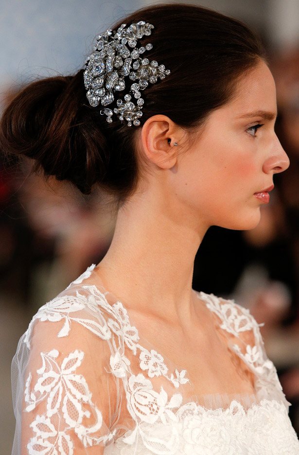 Невеста на показе Oscar De La Renta с прической, украшенной крупной брошью из драгоценных камней: