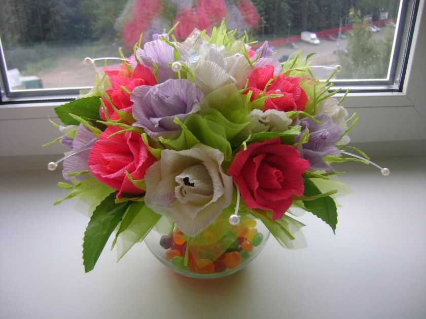 Оформление букета — достаточно интересный процесс, не забывайте: для того что бы все получилось оригинально и красиво не обязательно поэтапно следовать инструкции, достаточно просто придерживаться ее, добавляя что-то свое. Взяв за основу технику, приведенную выше и проявив свою фантазию можно с легкостью сделать множество других цветов, например таких, как ромашки и каллы.