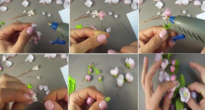 - Цветки яблони нужно расположить пучками на коричневых одревесневших веточках. Соберите по три-четыре цветка и бутон в пучок, сюда же добавьте три листочка треугольником и обверните всю группу коричневой тейп-лентой.