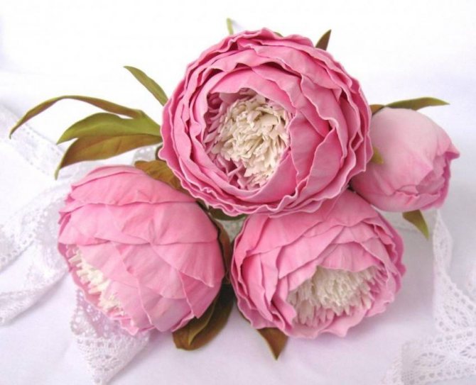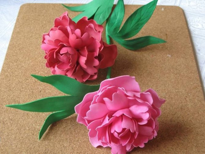 После того, как нужное количество роз мы сделали, приступаем к сборке самой композиции. Примерно по такой же технологии собирается свадебный букет из пионов – фоамиран универсален.