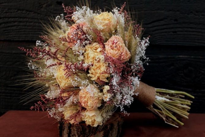 К главным плюсам такого свадебного букета можно отнести тот факт, что он совершенно не нуждается в специальных условиях.