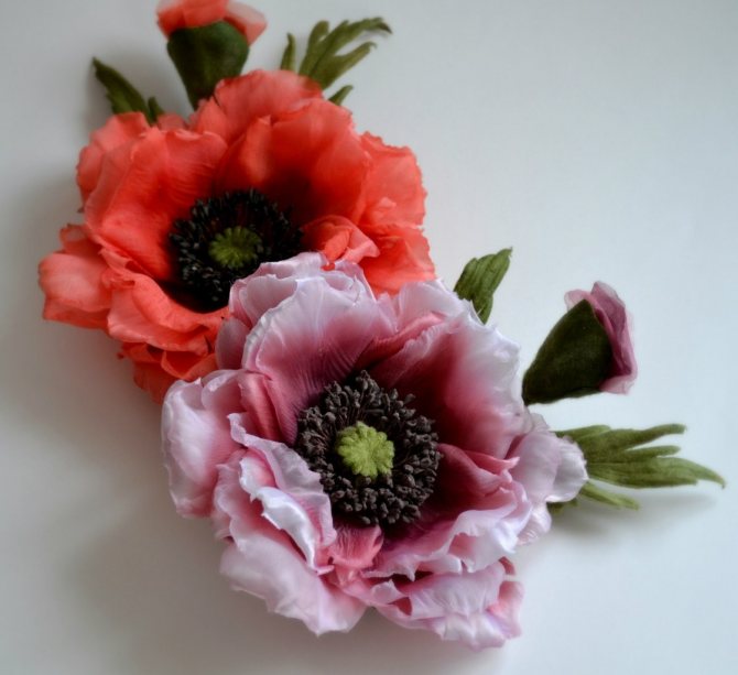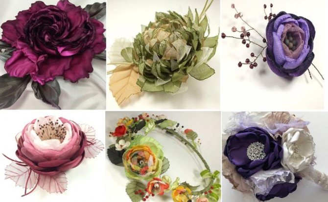 Готовые цветы закрепляют на проволочных каркасах, формируют букет. Ими декорируют плафоны светильников, дамские сумочки, ободки для волос и многое другое. Шикарно смотрятся такие цветы на панно.