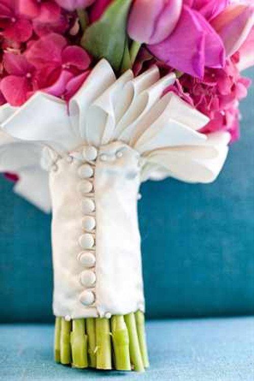Для букетов искушенных невест советуется подобрать нечто более сложное, чем драпировка ножки букета лентами или аналогичными материалами. Закажите корсет для букета. Это может быть «рукав» ткани, точно соответствующий диаметру ножки или кусок материи, зашитый или застегнутый на пуговицы прямо на ножке. Украсьте ткань жемчугом, кристаллами, вышивкой шелком, добавьте аксессуары, схожие по стилистике с украшениями невесты. Тогда букет будет выглядеть произведением искусства.