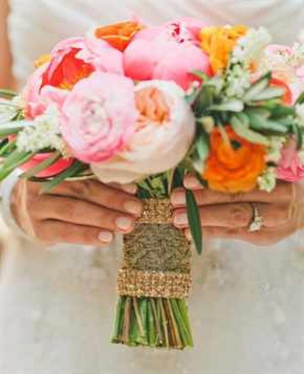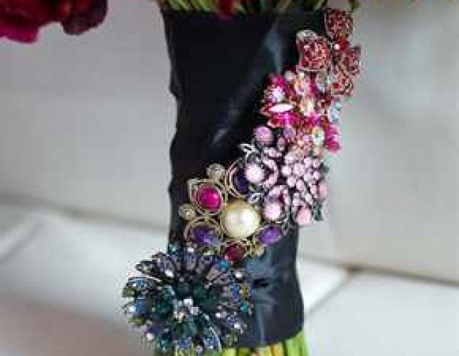 - Броши и булавки – удел ретро-свадеб. Украшая ножку букета брошками с полудрагоценными камнями или булавкой из серебра или золота, невеста создает оберег для своего счастья.