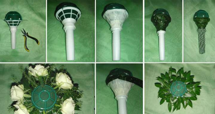 Это своеобразный каркас для цветов, который представляет собой пластиковую ручки с круглой губкой наверху, которая пропитана водой. Цветочная композиция вставляется в эту губку и закрепляется, что позволяет цветам питаться и сохранять свой вид на протяжении долгого времени. Это отличный вариант для тех, чье свадебное торжество начинается ранним утром и закончится далеко за полночь.