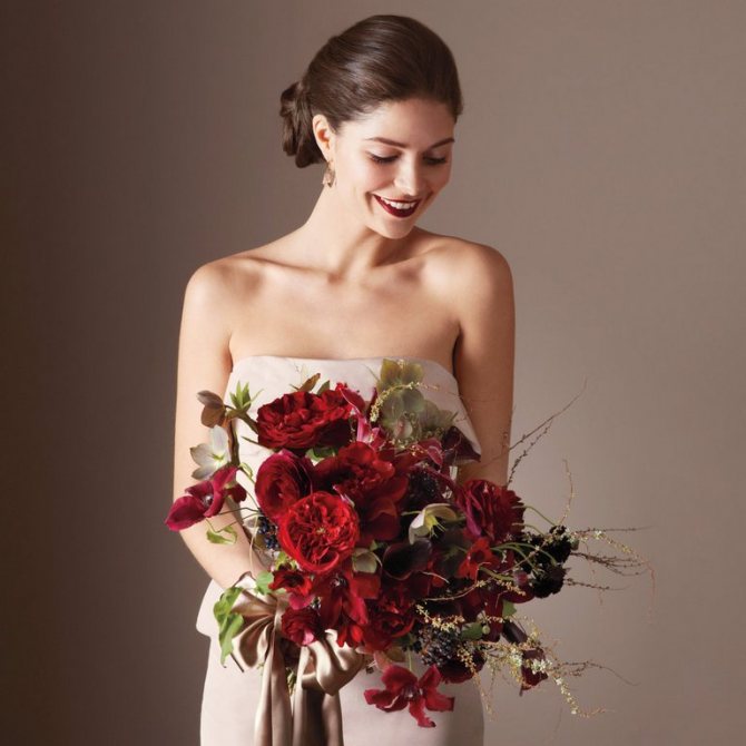 Свадьбу обычно проводят в городе в банкетном зале. Для свадьбы в стиле эко или рустик букет слишком яркий, а для классической европейской свадьбы — в самый раз. Время года — осень, зима, ранняя весна. Красные ягоды не испортят, а лишь украсят бордовый букет невесты. Фото ниже – тому подтверждение:
