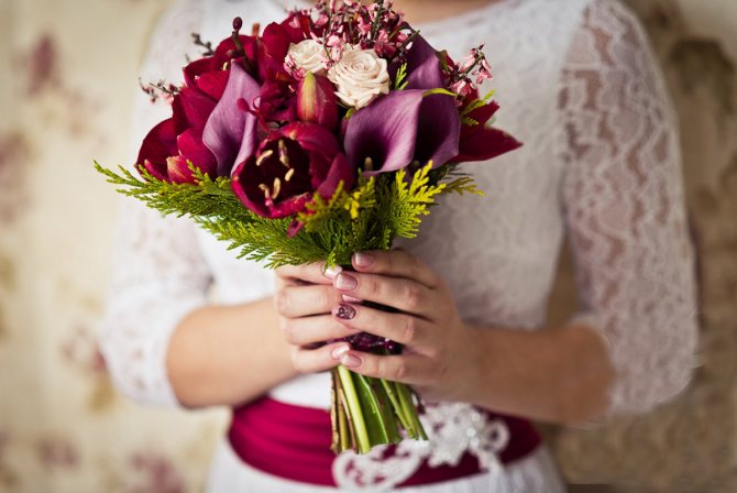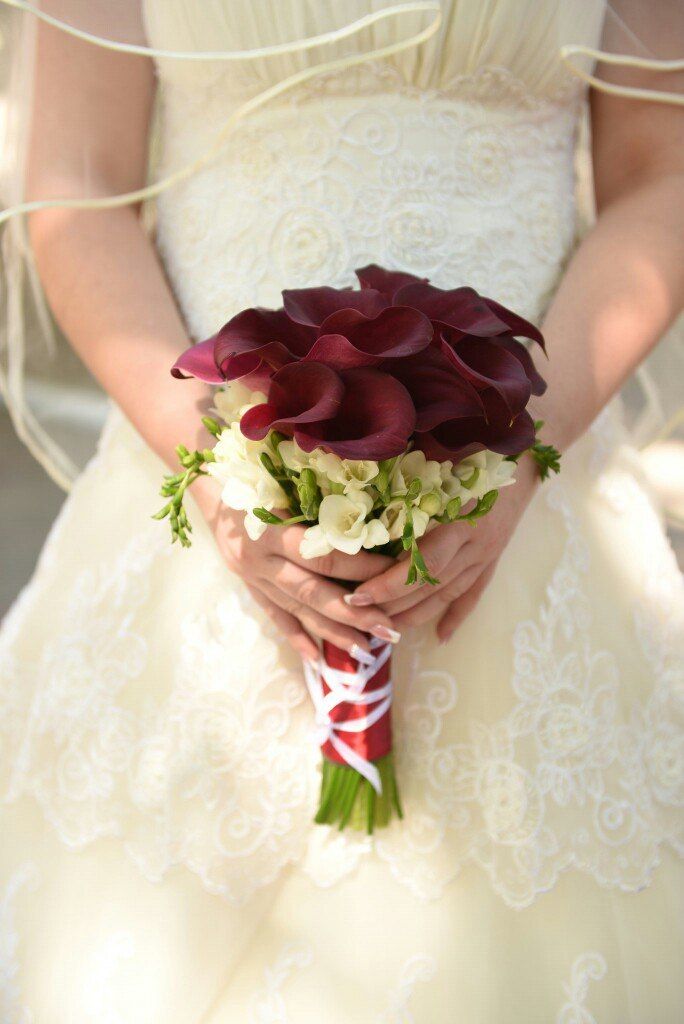 Тёмно-красные каллы идеально дополнят образ юной девушки. Эти цветы являются знаком восхищения, красоты, преклонения. В букете невесты каллы станут талисманом будущего семейного счастья и благополучия. Они хорошо смотрятся как в монобукете, так и со светлыми розами и тёмными орхидеями.