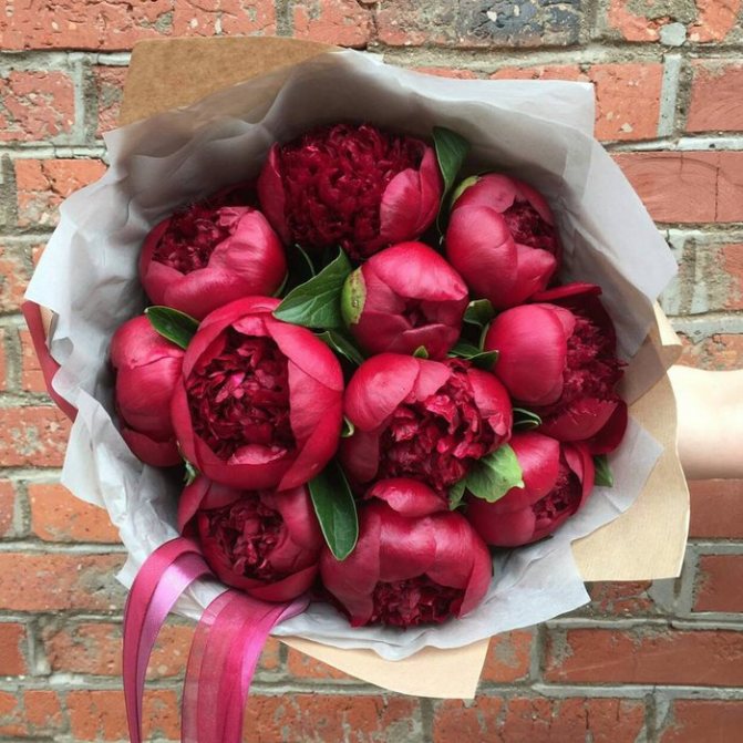 Бордовую композицию часто делают без упаковки, перевязывая стебли атласной лентой. Иногда можно увидеть букет, оформленный белыми кружевами, плотной бумагой, тканью с бантами из лент.