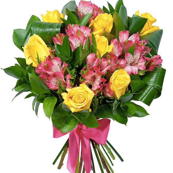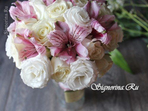 Сочетание нежных роз и необычайно милых в своем загадочном изяществе лепестков альстромерий, украшенных множеством цветных крапинок-прожилок, выражают два противоположных начала – силу с крепостью духа и мягкость с кокетливостью.
