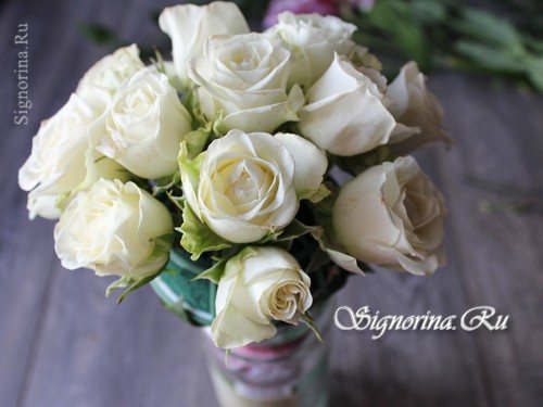 12) Обрежьте стебли всех цветов на расстоянии 5-6 см от бутонов. Для удобства работы поместите портбукетницу в небольшую стеклянную банку. Сформируйте из роз основу букета, начиная сверху и двигаясь вниз. Вдавливайте цветы аккуратно, держа их под бутоном, чтобы не повредить.