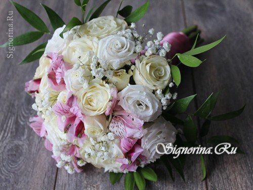 Свадебный букет, нежный и гармоничный, готов. Благодаря флористической пене он сохранит свежесть без воды около трёх суток.