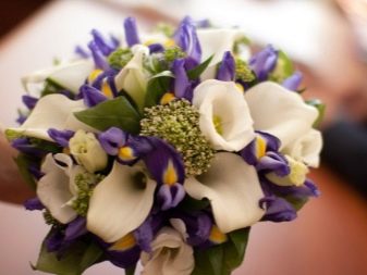 С нежными фиолетово-жёлтыми ирисами особенно выигрышно сочетаются белые или жёлтые перуанские лилии. Конечно, такой яркий букет требует должного обрамления – ярких аксессуаров и простого фасона платья, чтобы разные элементы образа не вступали в конфликт за главную роль.