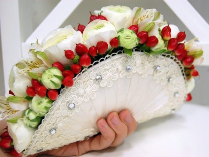 Оригинально смотрятся композиции из ткани и лент, из шелка можно изготовить замечательные розы. Их можно украсить стразами, бусами. Среди примеров, как должен выглядеть хороший букет, сочетание нежно-розовых цветов с яркими ягодами.