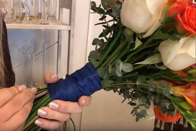 Последней по периметру добавляем зелень. Обматываем стебли тейп-лентой ближе к бутонам, тогда композиция получится плотной. Формируем «ножку» аранжировки. Подрезаем стебли, оставляя длину примерно в две ладони. Обязательно ставим аранжировку на воду, чтобы отпоить её перед торжеством.