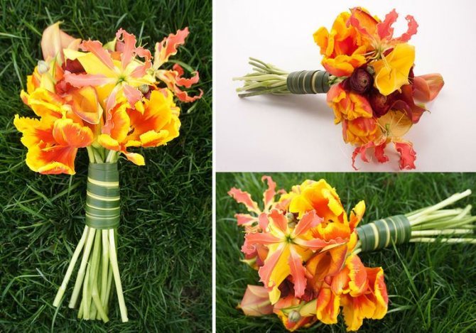Поскольку у большинства цветов, используемых для композиции, стебель изогнут, их можно собирать в параллельной технике, просто прикладывая друг к другу. За счёт природной линии роста, они создадут живописный, раскидистый силуэт. У тюльпанов мягкий стебель и они могут слишком сильно изгибаться. В этом случае их опирают на более устойчивые каллы. Глориоза имеет нежные лепестки и чтобы уберечь от заломов, её немного приподнимают над остальными бутонами. Но это не все особенности тропической красавицы.
