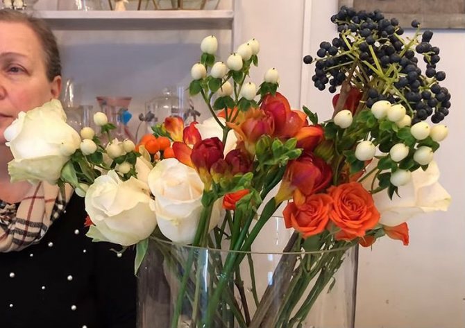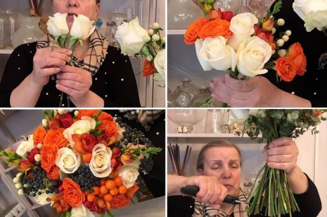 Добавляем в букет оранжевые спрей-розы, затем фрезию. Ставим бутоны разного цвета группами, чтобы контраст хорошо читался. Продолжаем добавлять ягоды, тюльпаны, а затем вновь розы и фрезии, пока не наберём нужную массу букета. Не забываем немного вытягивать противоположные края, чтобы при взгляде сверху хорошо просматривался овал.