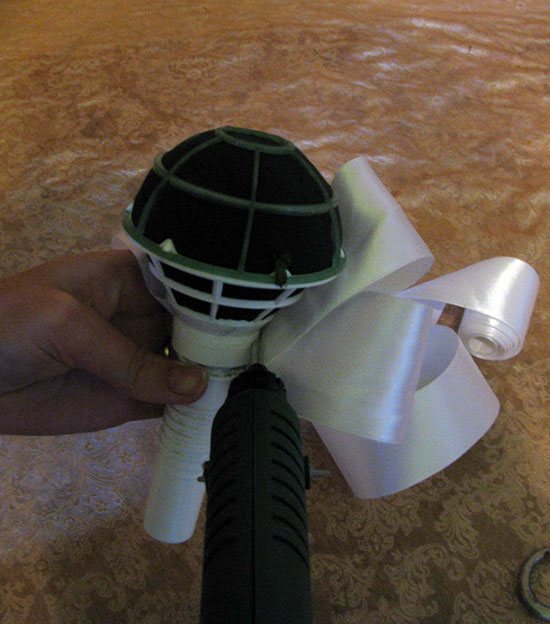 Соединяют стебли и обматывают тейп-лентой. Украшают ножку атласом, бисером, кружевом — вариаций множество.